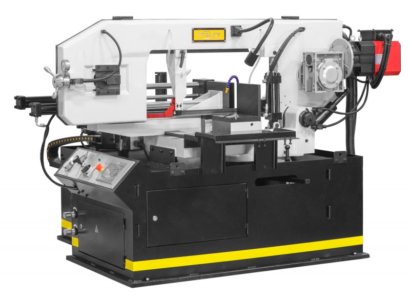 Автоматический ленточнопильный станок, предназначен для пиления труб максимальным диаметром 330 мм и прямоугольной профильной заготовки 460x250 мм под углом 90°. На автоматических станках возможна работа как в ручном режиме, когда каждая операция выполняется вручную посредством нажатия соответствующей кнопки, так и в автоматическом режиме, когда станок выполняет весь цикл резания (зажим заготовки – подвод заготовки – запуск пилы – опускание рамы – остановка пилы – подъем рамы – отжим тисков). В последнем случае оператор должен лишь обеспечить подачу заготовок, предварительно настроить концевой ограничитель на необходимую длину получаемых заготовок и запустить цикл пиления кнопкой «Пуск».