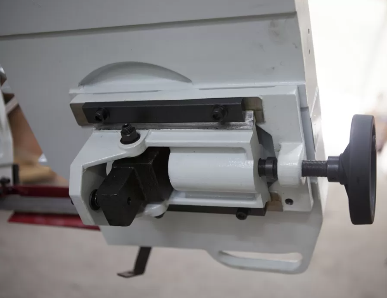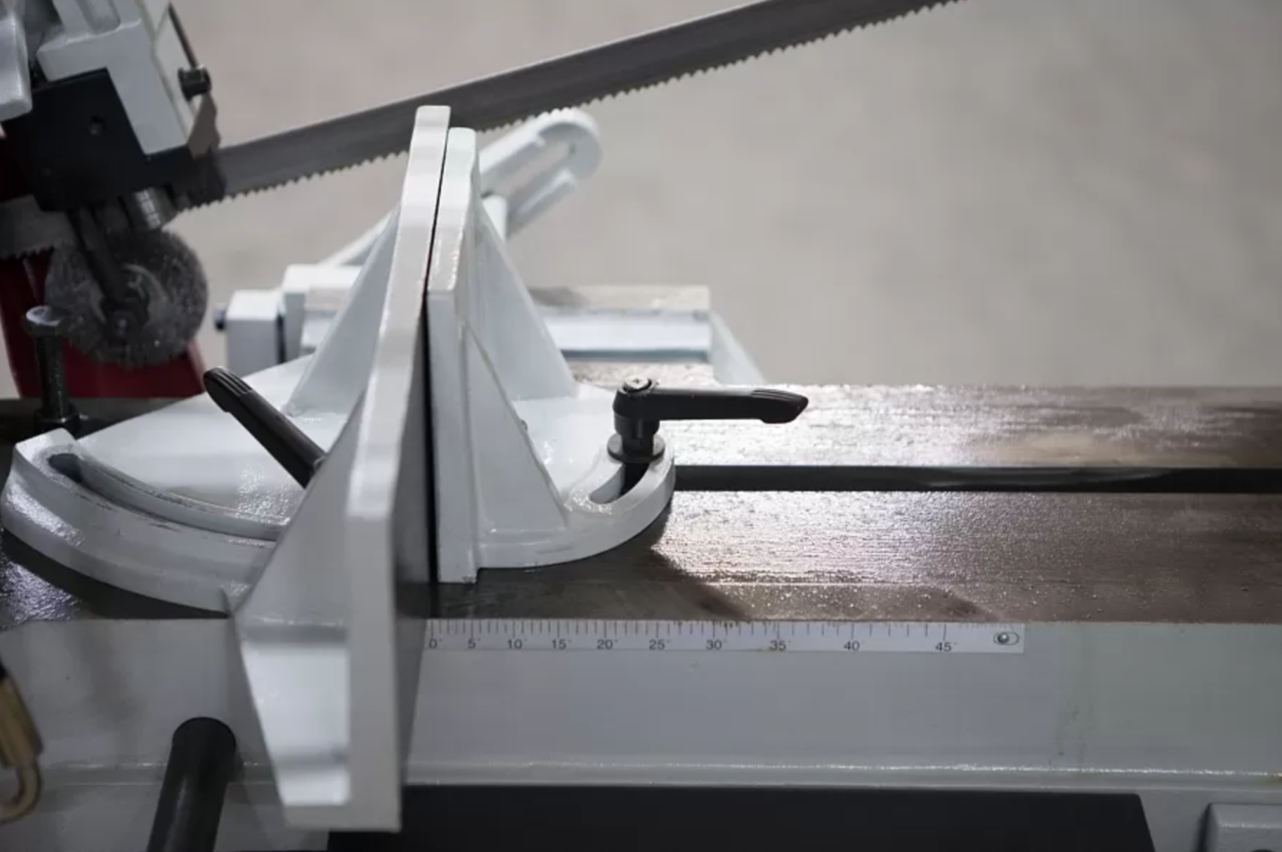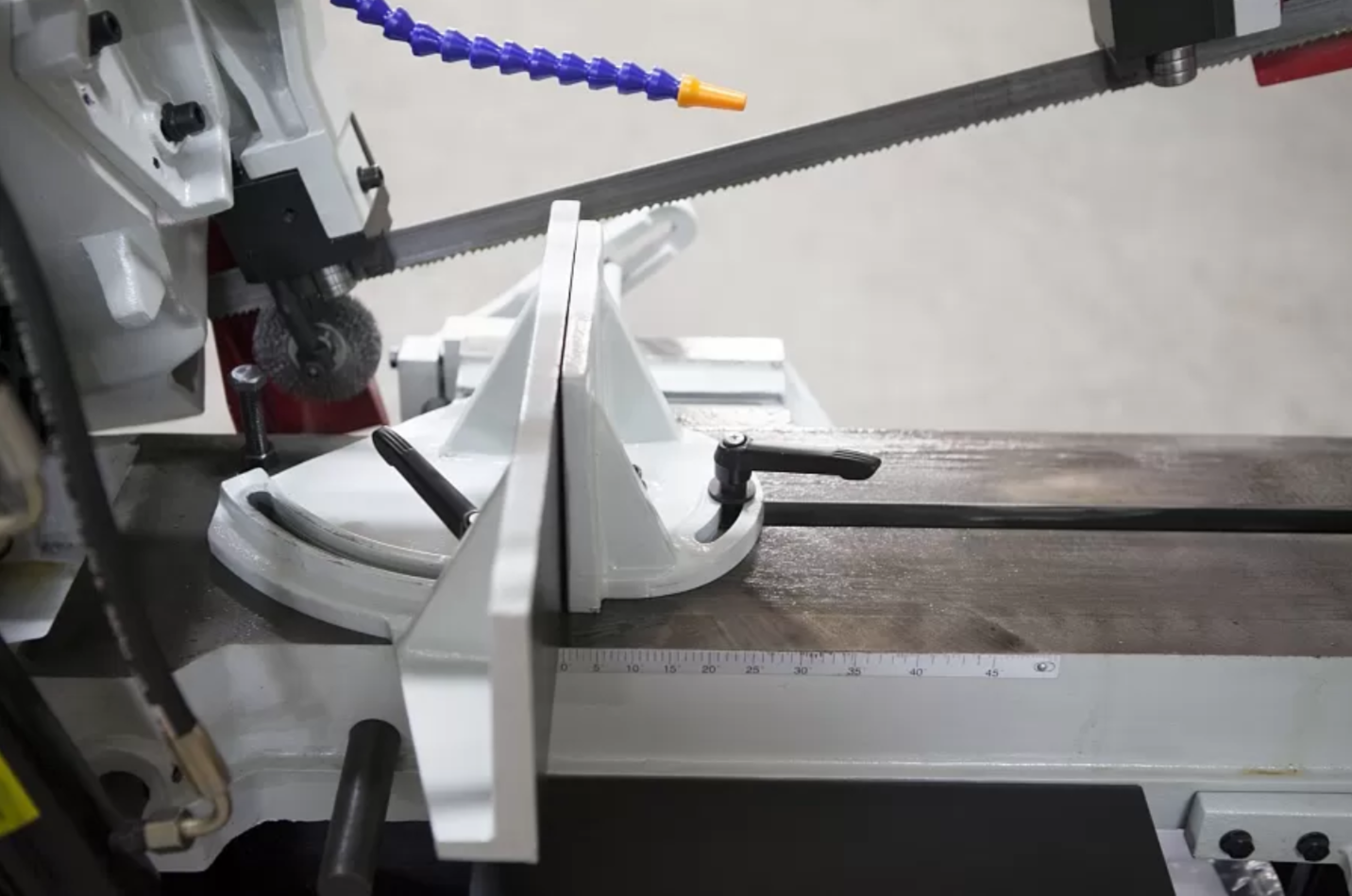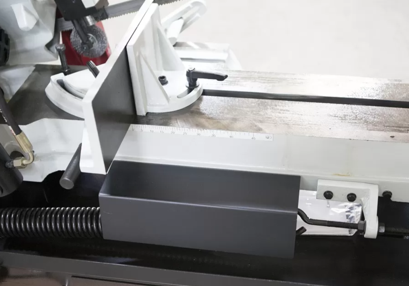 В рабочей зоне резания полотно точно ведется двумя направляющими головками. Станок имеет поворот губок тисков, для пиления под углом необходимо изменять угол установки тисков. Высота полотна 27мм позволяет пилить c высокой точностью и параллельностью полые и профильные заготовки под различными углами, в том числе и сплошные заготовки. Расстояние от пола до тисков составляет 580 мм.