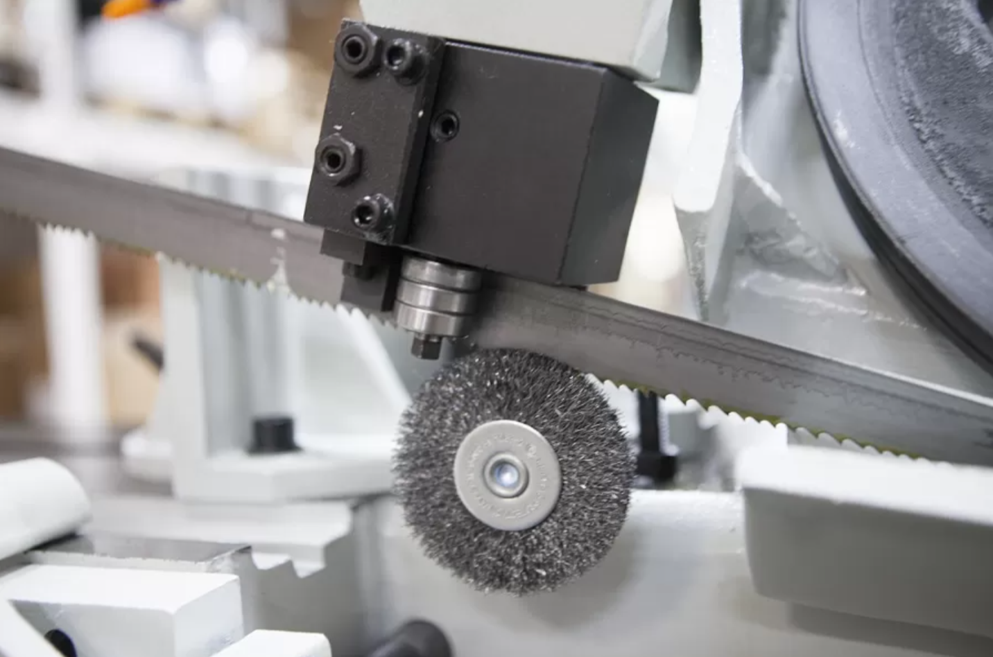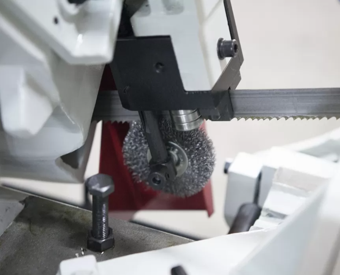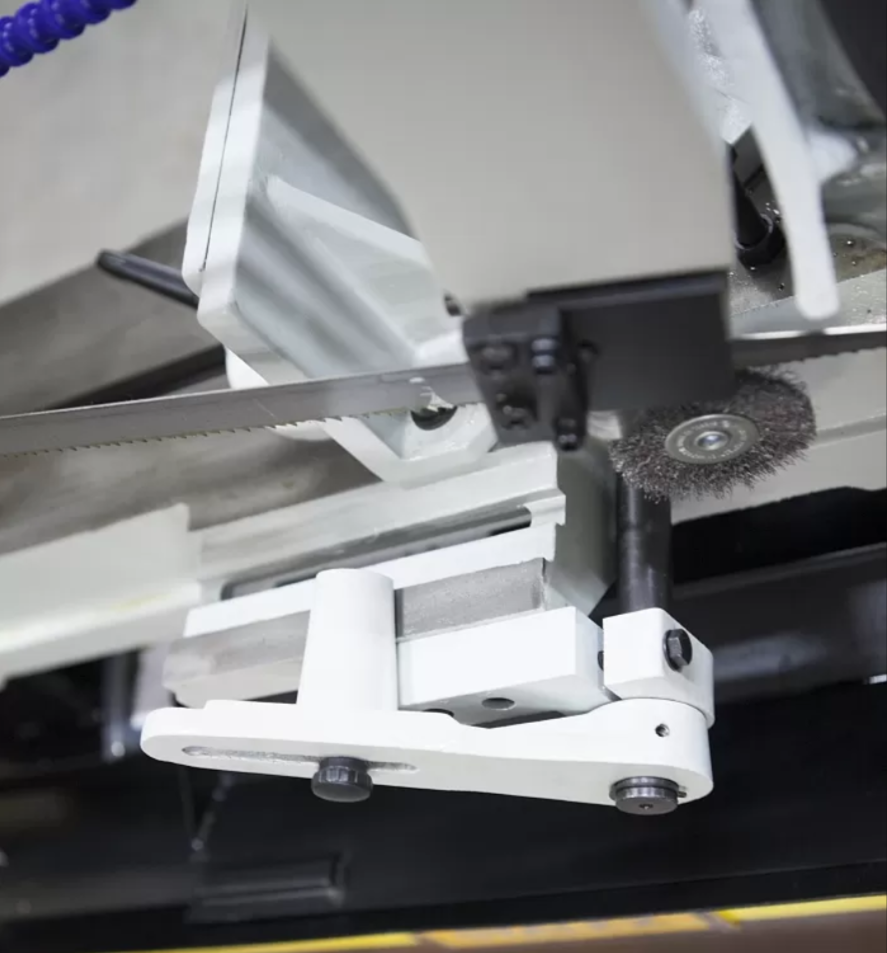 Механическая дисковая щётка (приводимая в движение от движения полотна). Зубчатый блок, с твёрдосплавными платинами и подшипниками для выпрямления полотна в зоне резания и качественной фиксации для стабильного пиления. |