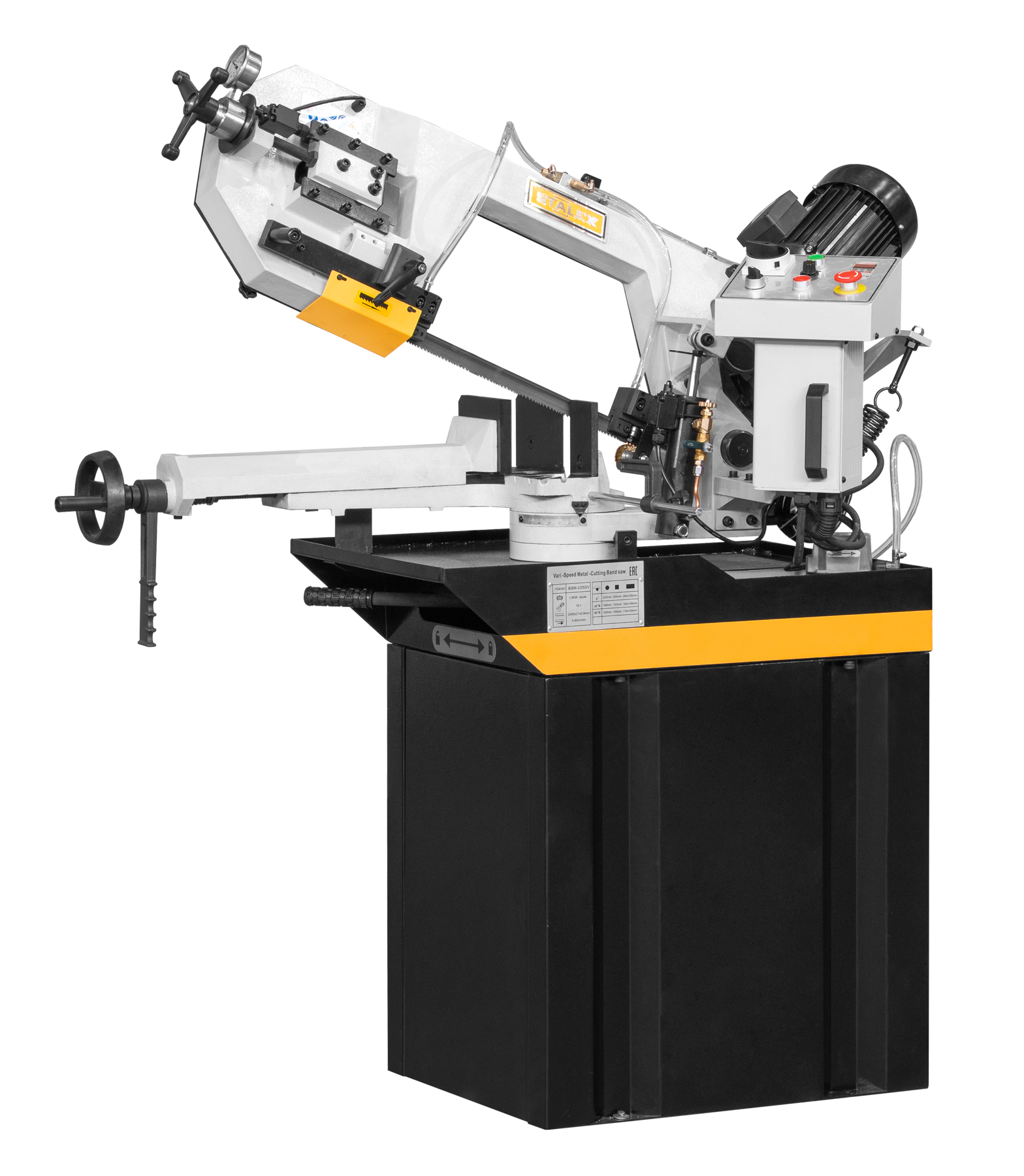 Модель имеет быстрорегулируемые тиски для резки под углом, поворачивается рама, а не заготовка. Тиски с системой быстрого отвода ускоряют процесс смены заготовки (ускоренный отвод подвижной губки происходит без вращения маховика). Зажим заготовки осуществляется тисками вручную, подача заготовки - также вручную. Наличие системы СОЖ в стандартной комплектации – позволяет добиться высокой производительности.