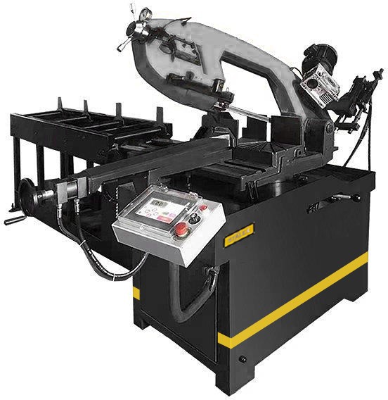 Модель Stalex BSM-270GА являются автоматическими ленточнопильными станками, консольного типа. Автоматические ленточнопильные станки, предназначены для пиления труб, балок и других заготовок, под различными углами и поворотом рамы станка в обе стороны. На автоматических станках возможна работа как в ручном режиме, когда каждая операция выполняется вручную посредством нажатия соответствующей кнопки, так и в автоматическом режиме, когда станок выполняет весь цикл резания (зажим заготовки – подвод заготовки – запуск пилы – опускание рамы – остановка пилы – подъем рамы – отжим тисков). В последнем случае оператор должен лишь обеспечить подачу заготовок и нажатие кнопки «Пуск». Станок оснащен гидравлическими тисками. На основной панели расположены: цветной сенсорный дисплей, с помощью которого можно задать программу и отслеживать процесс пиления, регулятор скорости опускания пилы и кнопка аварийного останова. В рабочей зоне резания полотно точно ведется двумя направляющими головками. Станок с возможностью поворота корпуса пилы в обе стороны от – 45° 0° до +60°, предназначен для пиления заготовок, под различными углами и при частой смене угла пила. Основные элементы cтанка Stalex BSM-270GА: Поворотный стол с возможность поворота пилы в обе стороны от – 45°… 0°…+45°…+60º, регулировка угла поворота вдоль шкалы Литая чугунная рама гарантирует жесткость станка и гасит вибрации Опускание рамы осуществляется под собственным весом Гидравлическая станция для автоматической бесступенчатой резки / плавная регулировка скорости опускания рамы (подвод и рабочий ход), бак 22 литра Зубчатый привод – закалённая и бронзовая зубчато-винтовая передача (червяная передача 25:1) Станция охлаждения, обеспечивает подачу СОЖ, расположена внутри рамы, бак 17 литров Точность движения ленты обеспечивается за счет твердосплавных пластин и роликовых подшипников Механический рольганг (конвейерные стойки подвода заготовок) – общей длиной 1 метр Стандартная комплектация для Stalex BSM-270GA: Подвижная направляющая с роликовыми подшипниками натяжения полотна Гидравлическая система движения рамы пилы Гидравлические тиски Скорость вращения пилы, плавная регулировка скорости 5-90 м/мин Маховик механического натяжения ленты Датчик контроля натяжения полотна – тензометр Защита – датчик на обрыв полотна (остановка станка) / датчики при открытии кожуха рамы (остановка станка) Помпа для подачи СОЖ и регулировочные краны для регулировки напора СОЖ Лампа дополнительного освещения Лазерная указка линии реза Механический рольганг (конвейерные стойки подвода заготовок) – общей длиной 1 метр Пила ленточная квалитет М42